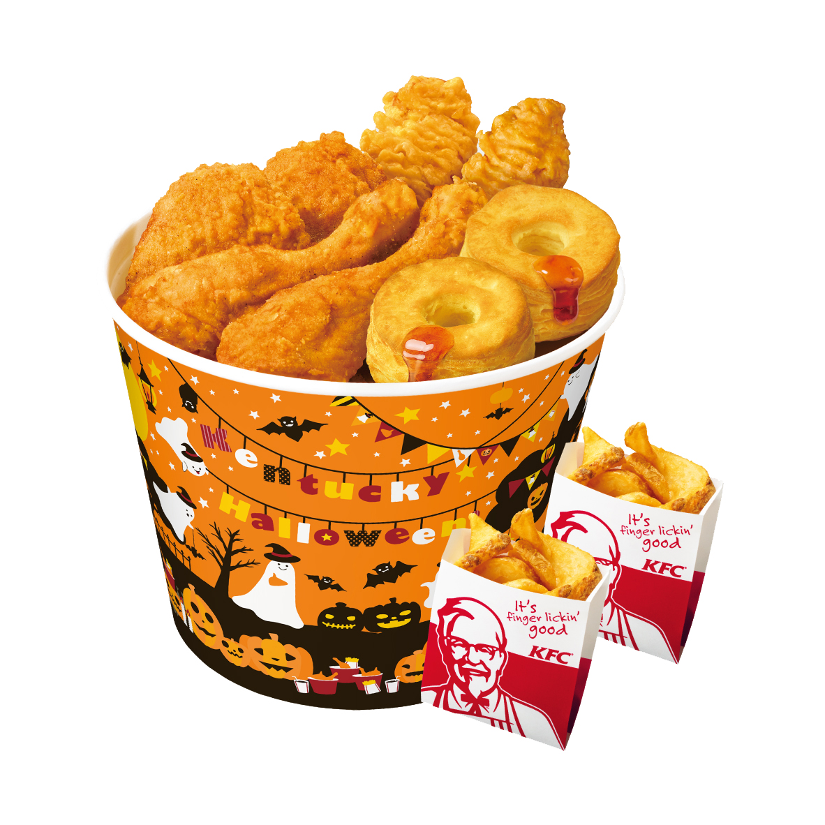 ハロウィンをイメージした楽しいデザインのバーレルに、「オリジナルチキン」と「カーネルクリスピー」「ビスケット」「カーネリングポテト」が入ったボリューム満点のセットとなっています。