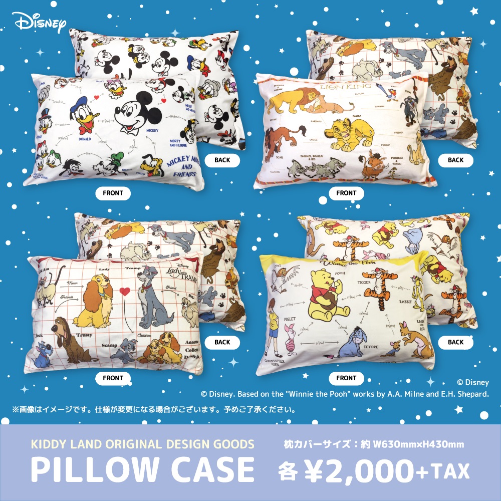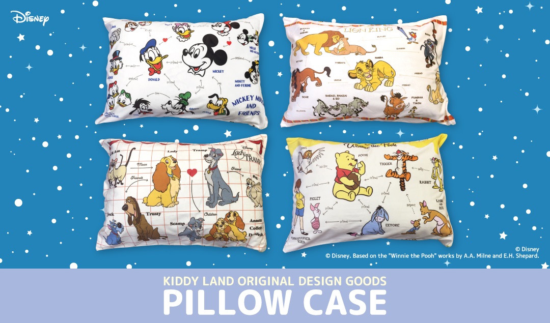 そんなキデイランドの枕カバーに9月3日「秋の睡眠の日」に合わせ、「ミッキー&フレンズ」、『くまのプーさん』、『わんわん物語』、『ライオン・キング』の各物語に出てくるキャラクターの関係性がわかるアイデア満載で凝ったデザイン4種が登場します。
