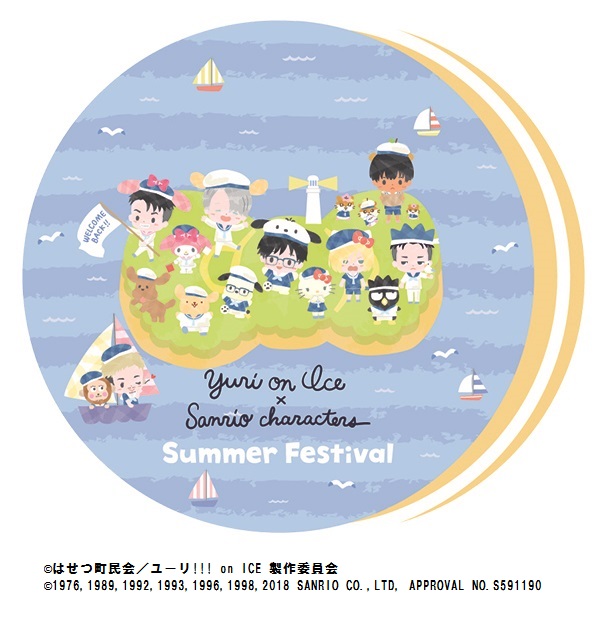 『ユーリ!!! on ICE』とサンリオのキャラクターたちのバックには、ぷかぷかと優雅にヨットが浮かんでいます。