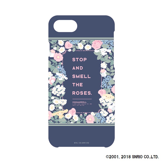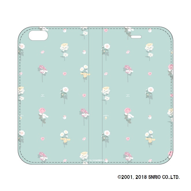お花とたわむれる「シナモロール」たちが総柄でデザインされた手帳型ケース。