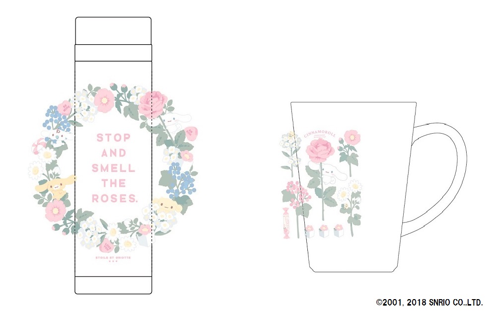 エレガントなお花の中に「シナモロール」がかくれんぼしている「ステンレスボトル」と「マグカップ」
