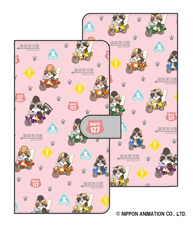 ガーリーなピンク色に羅巣華流團の総柄がデザインされた手帳型スマホケース。