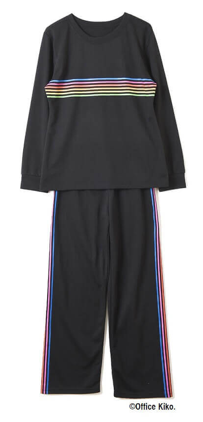 ゆったりした首周りのブラックのデザインにはレインボーのラインが。