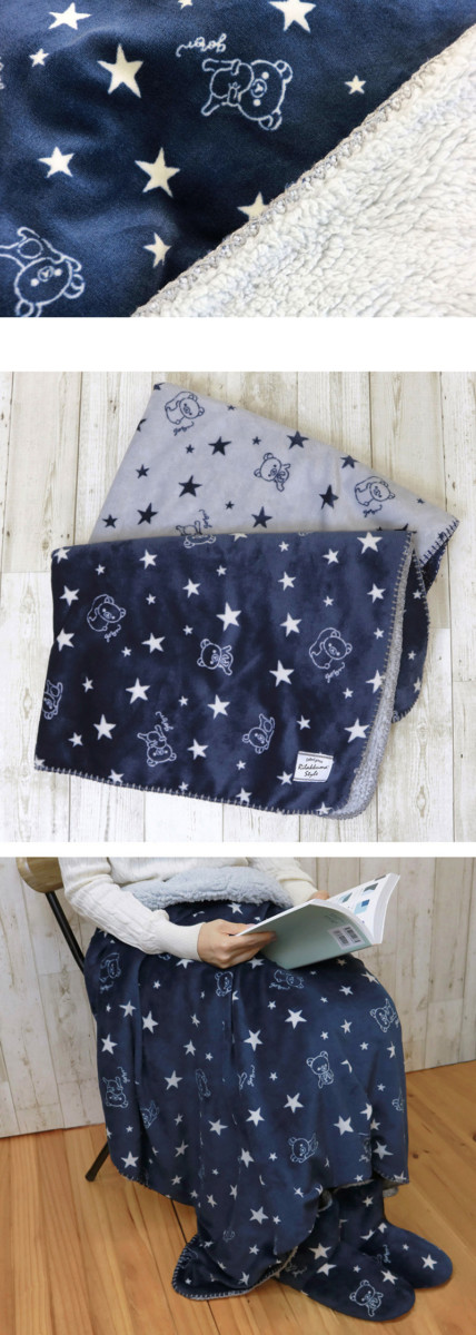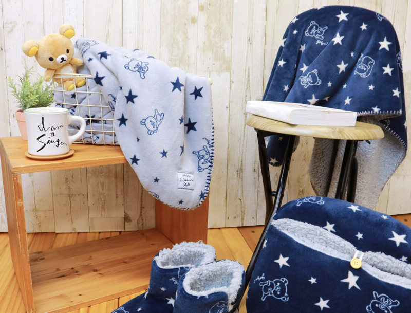 星柄リラックマデザインのWafil素材を使用した、防寒アイテム「ブランケットS・L」「腰巻ブランケット」「ルームシューズ」「フットインクッション」「ネックウォーマー」が、キデイランドに登場!