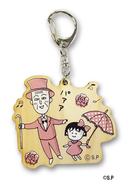 おめかししたまる子とおじいちゃんが可愛いウッドキーホルダー。