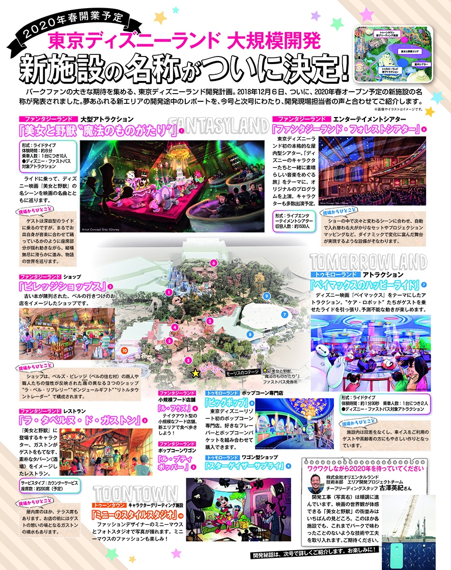 2019年1月11日から開催の東京ディズニーリゾート35周年グランドフィナーレなどのほか、2020年春開業予定「東京ディズニーランド大規模開発」についての速報、新施設の名称と、開発現場からの貴重なひとことが掲載されています。