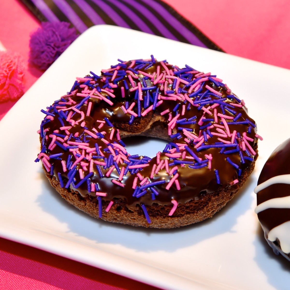 オールドファッション チョコレートに深くて濃い味わいを楽しめるビターなチョコを重ね、ピンクと紫のスプリンクルを散りばめた、ミステリアスな雰囲気のドーナツ。