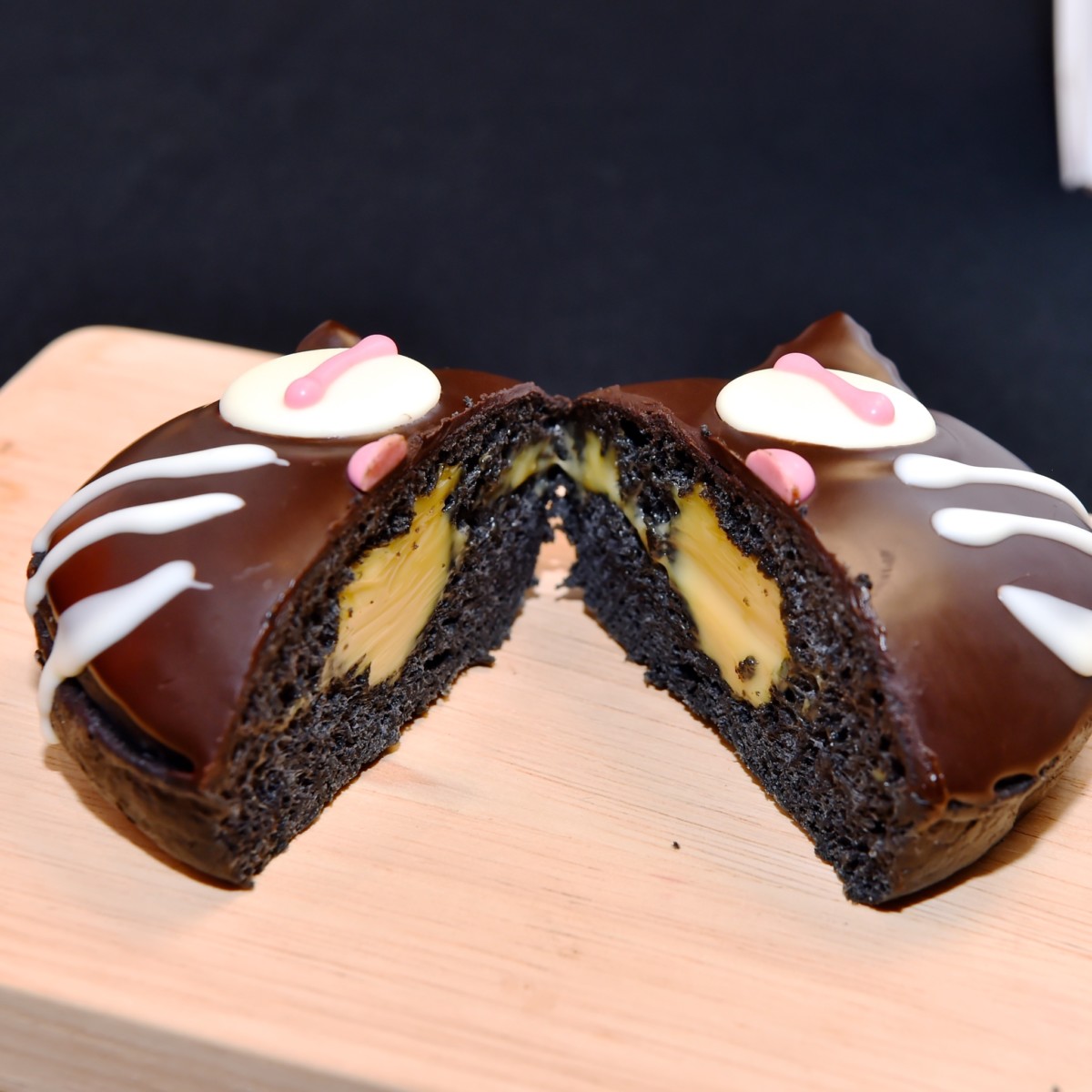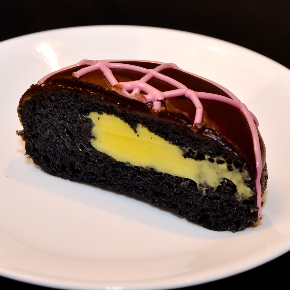 真っ黒な生地に優しい甘さのキャラメルカスタードを詰め、目にはホワイトチョコがのっています。