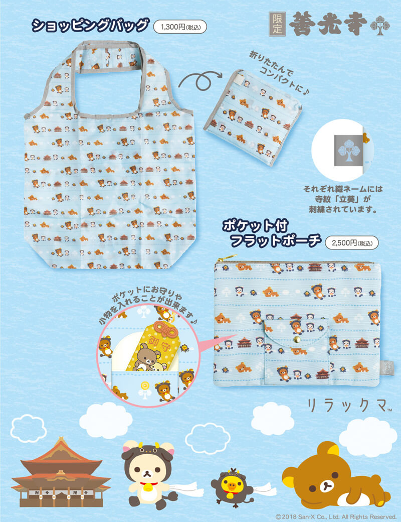 長野県の「善行寺」とリラックマのコラボグッズに、「ショッピングバッグ」と「ポケット付きフラットポーチ」が登場しました。