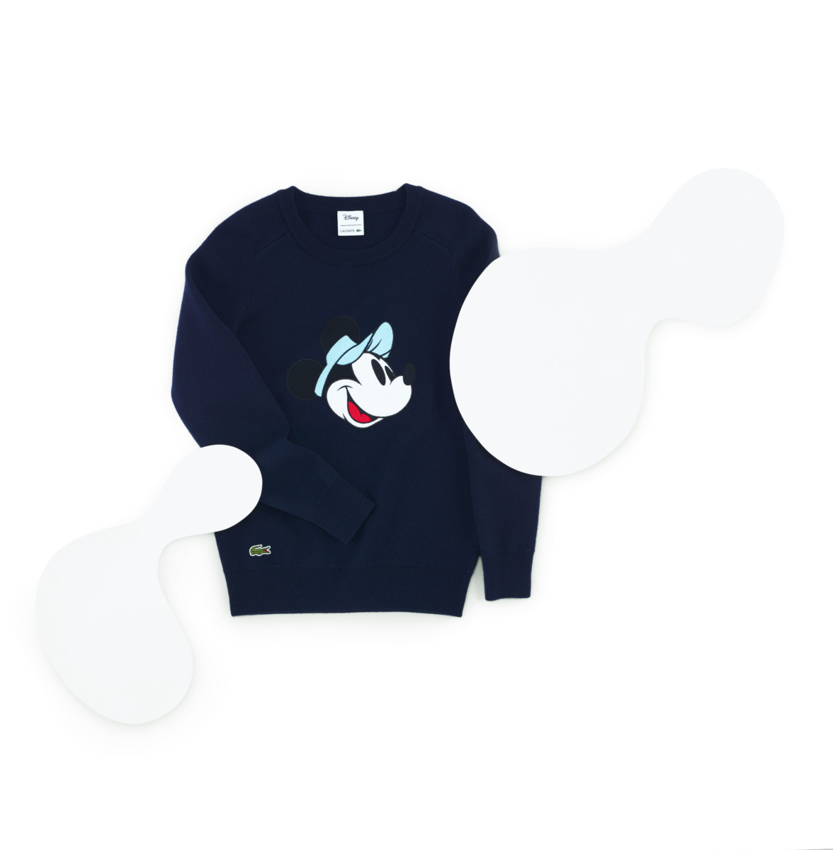 カラーパレットは、ネイビーブルー、ホワイト、ヘザーグレー、ペールピンクと、グリーンを少し効かせたクリアブルーやブリリアントレッドのような鮮やかな色味をミックスさせ、ラコステとディズニーの世界観が忠実に表現されています。