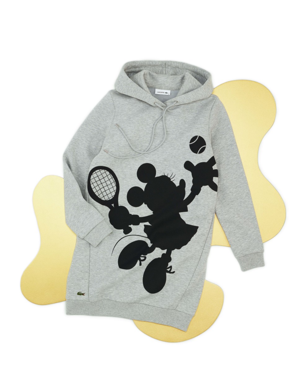 ポロシャツの胸元には、エレガントにプリーツスカートをはき、まさにサーブをしようとするミニーマウスの姿が刺繍され、フリースドレスの前と後ろにはそのシルエットがプリントされています。