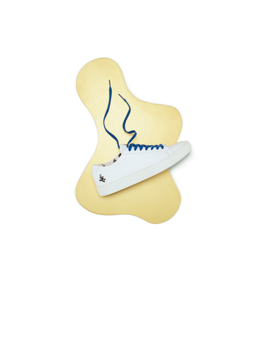 ブラックのミッキーマウスをヒール部分に配したホワイトスニーカーは内側のプリントにも注目です。