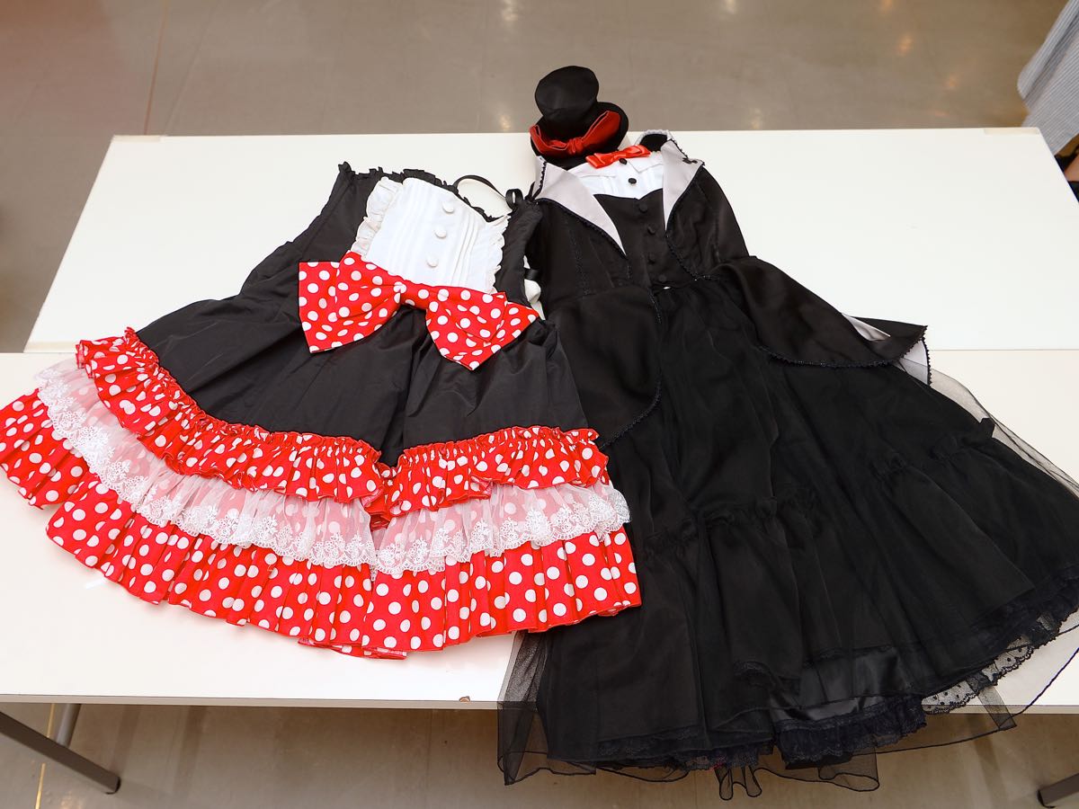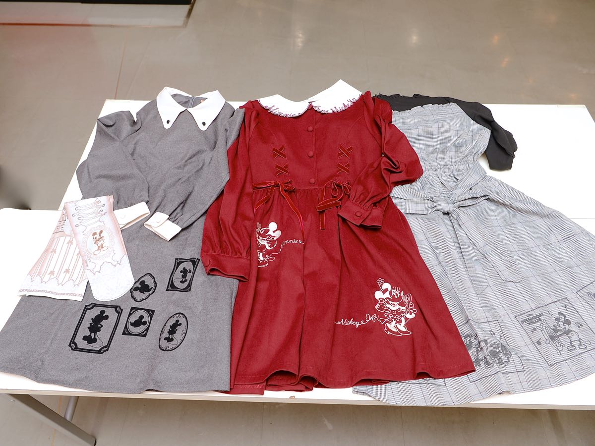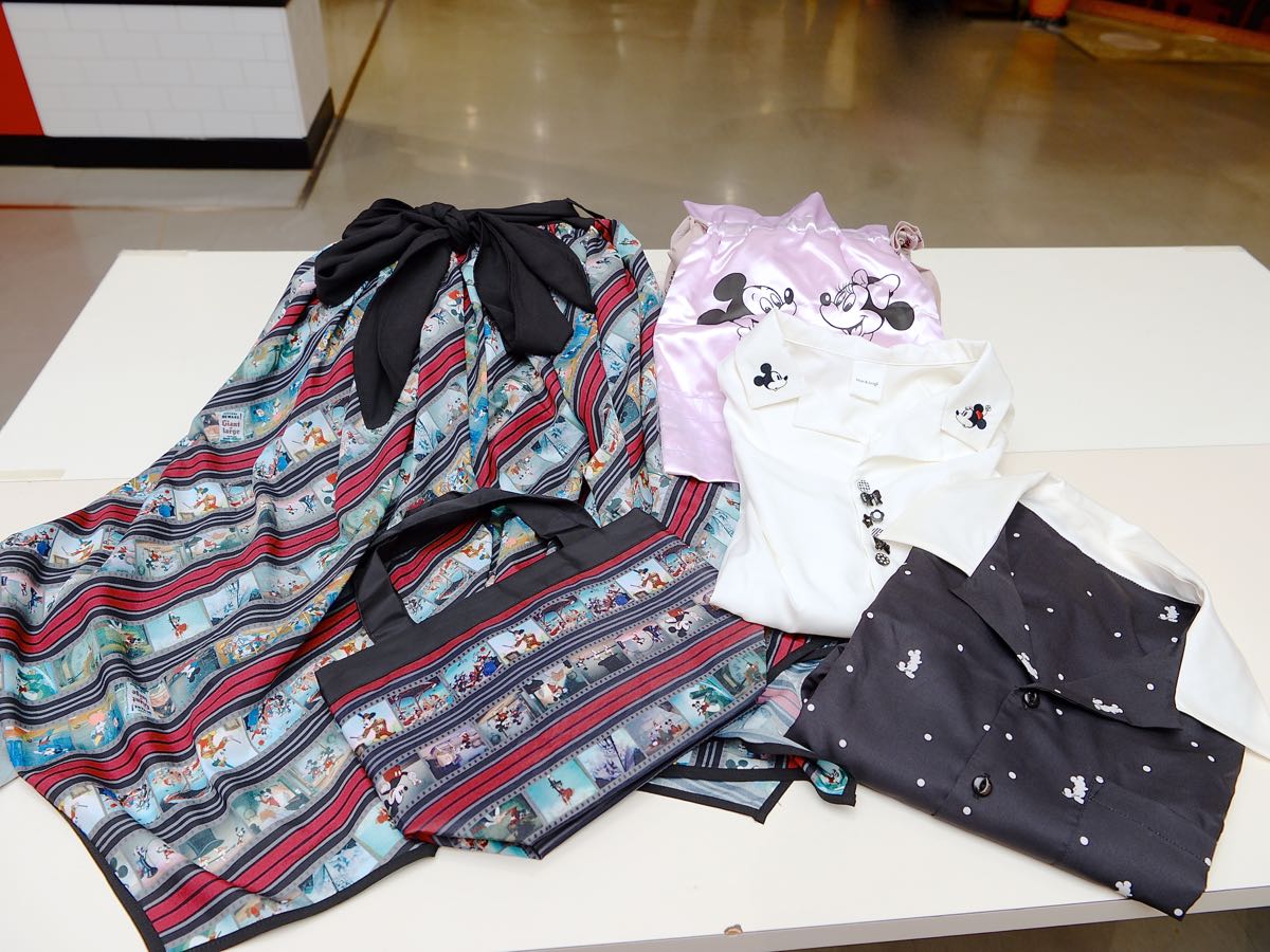 ミッキーマウスの数々の名場面をあしらったスカートや、光沢感のあるブラウス