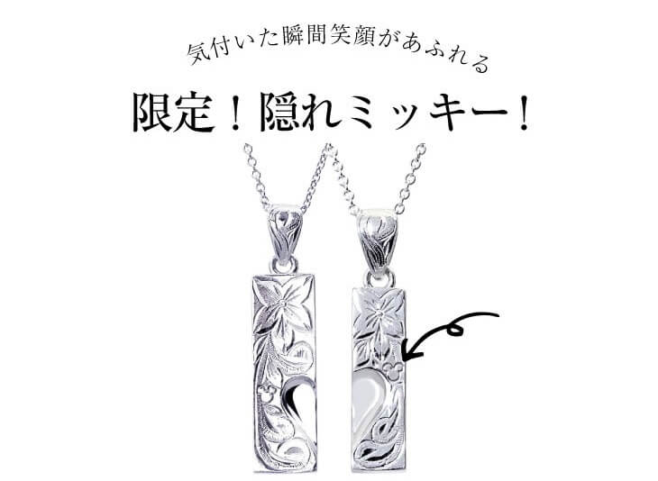一見すると、普通のハワイアンジュエリーに見えますが、よ~くモチーフを見てみると、繊細なデザインの中に隠れミッキーが!
