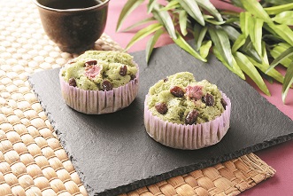 宮城県産よもぎを練り込んだ蒸しぱん生地に、北海道産小豆の甘納豆と桜花の塩漬けをトッピング。