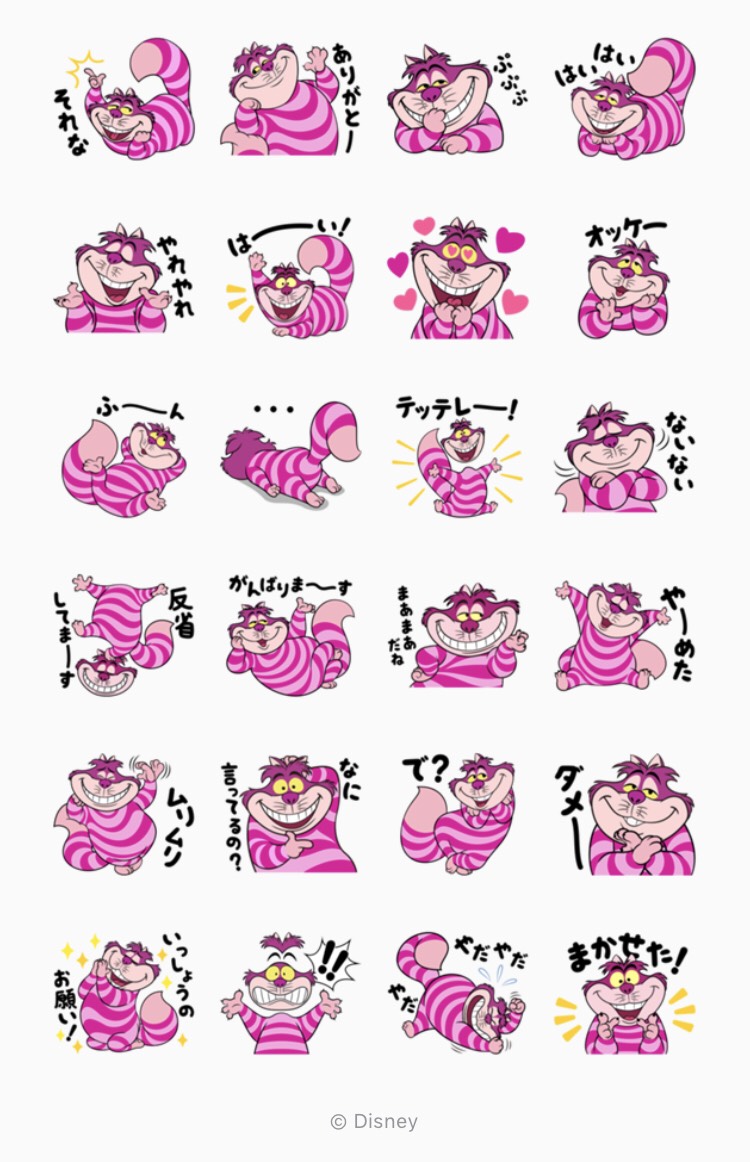 『ふしぎの 国のアリス』に登場する「チェシャ猫」のスタンプ。