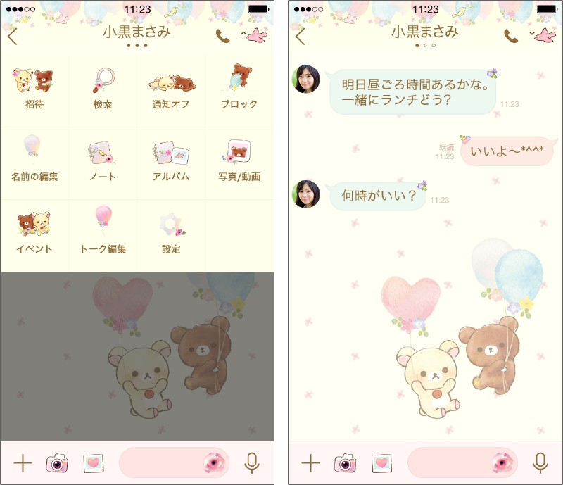 トーク画面には、かわいいポーズで風船を持つコリラックマとチャイロイコグマがいます。