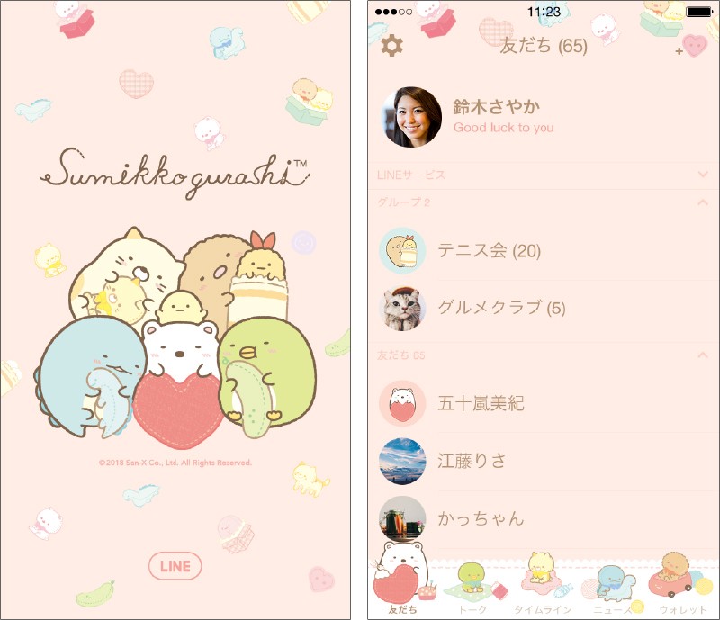 LINE着せかえ「すみっコぐらし〜てづくりぬいぐるみ〜」は、LINE内「着せかえショップ」、「LINE STORE」にて好評発売中です。