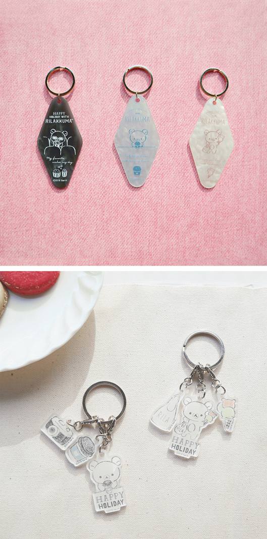 写真下は「リラックマ」と「リラックマ」のホリデーを彩るアイテムがセットになった3連アクリルキーホルダー。