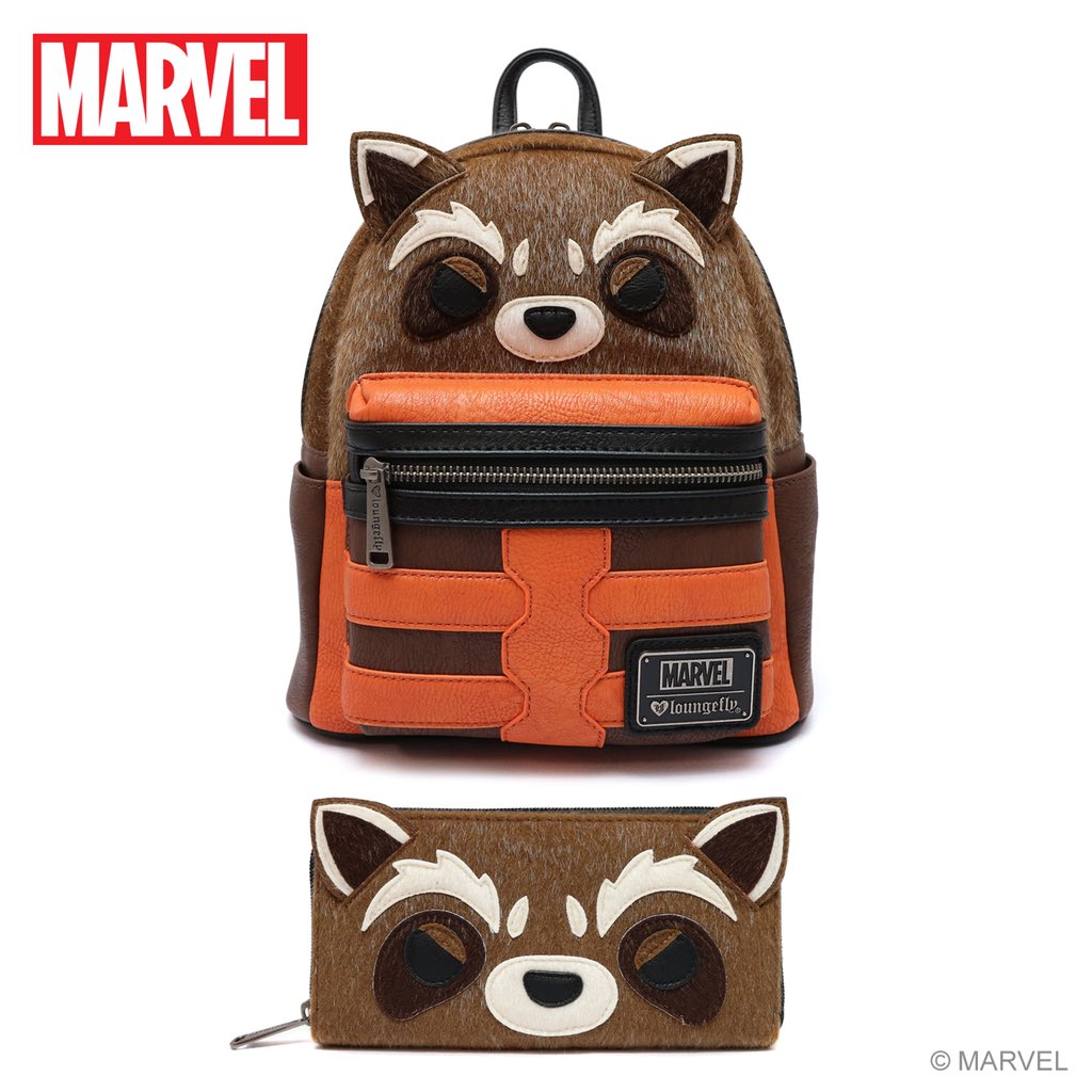 ガーディアンズ・オブ・ギャラクシーの人気キャラクター、ロケットを、フェイクファーを使用して大胆にアレンジしたミニリュックとウォレット。