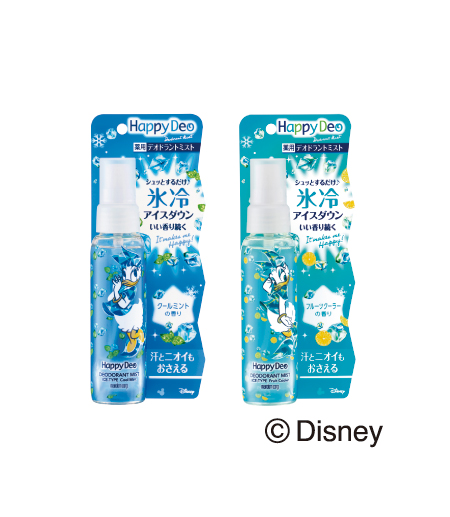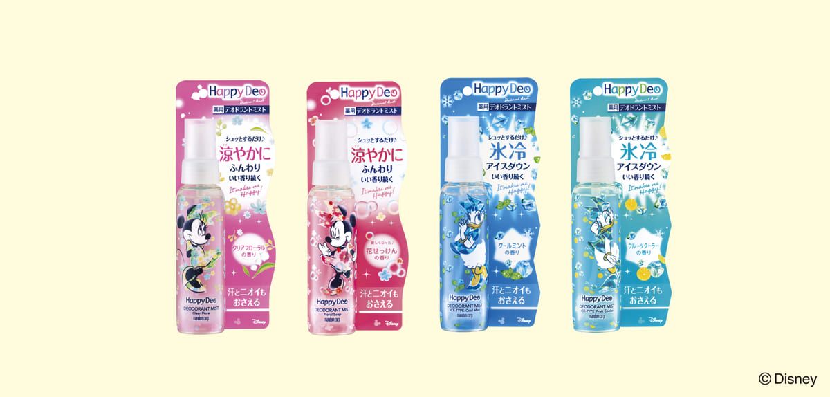ひとふきでひんやり心地良い「ハッピーデオシリーズ」のデオドラントミストは、いつでもサッと使え、ミストタイプで使う時の音が静かなため人気を集めているアイテム。