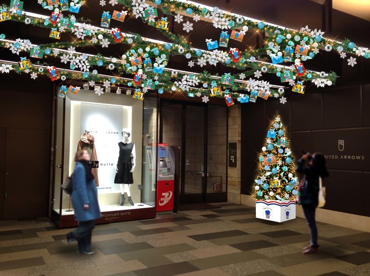 内容:「マロニエゲート銀座1」エントランスのクリスマスツリーイルミネーション、館内のクリスマスツリーの装飾