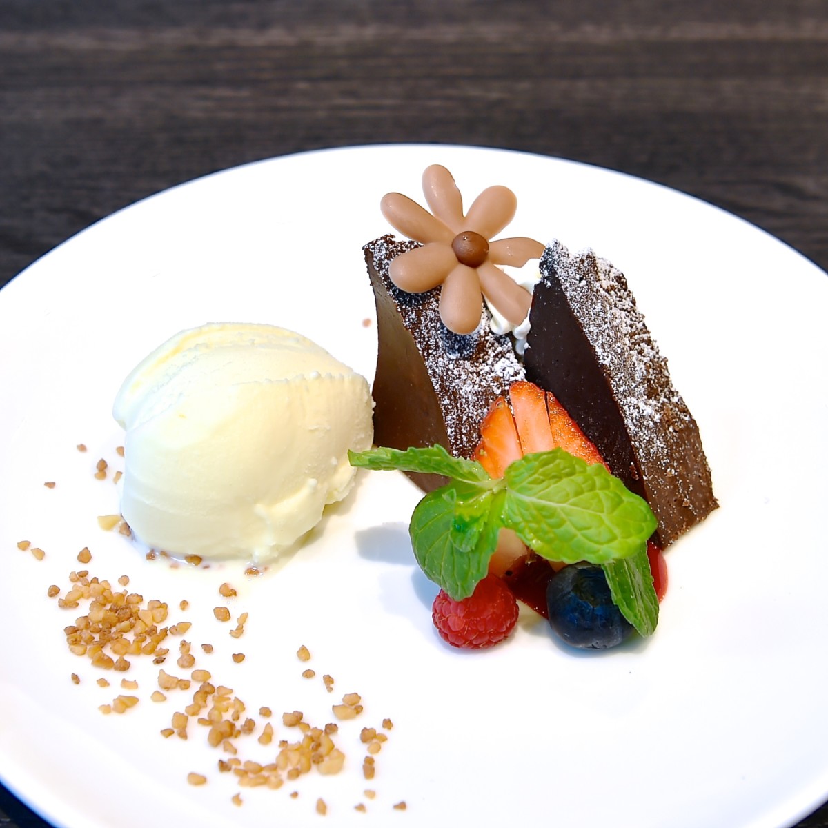 「ルル メリー」を代表するスイーツ「ショコラテリーヌ」とバニラアイスクリーム、ベリーの盛り合わせ。