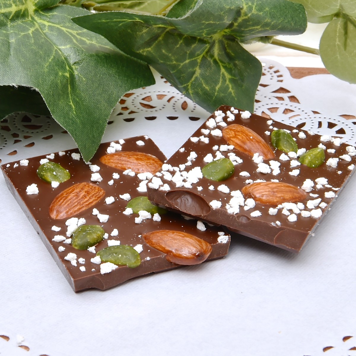 スイートチョコレートにアーモンドとピスタチオ、ホワイトクランチをトッピングした「アーモンド&ピスタチオ」