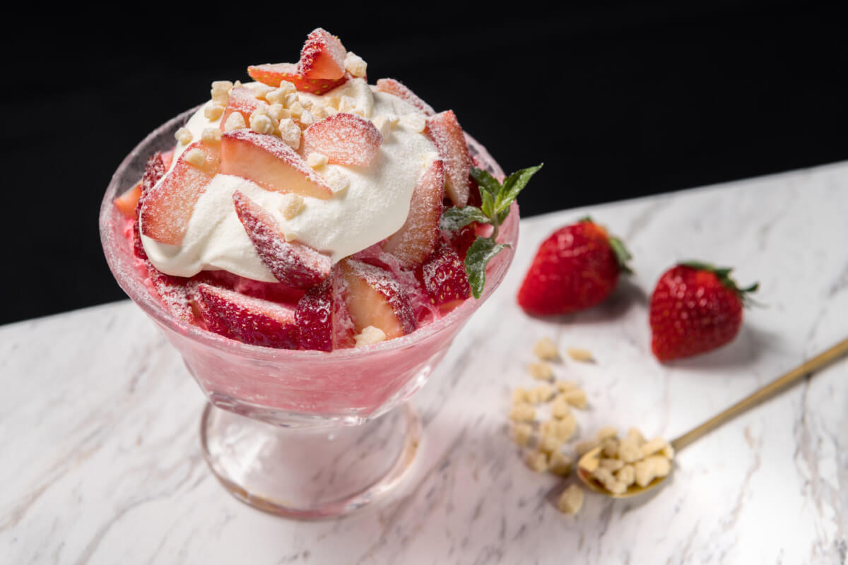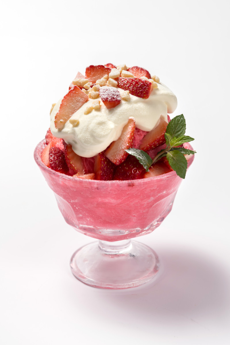 「ホワイトチョコレートストロベリーかき氷」は、ミルキーなイチゴアイスブロックを削り、ホワイトチョコレートホイップクリームとイチゴをたっぷりとのせたかき氷。