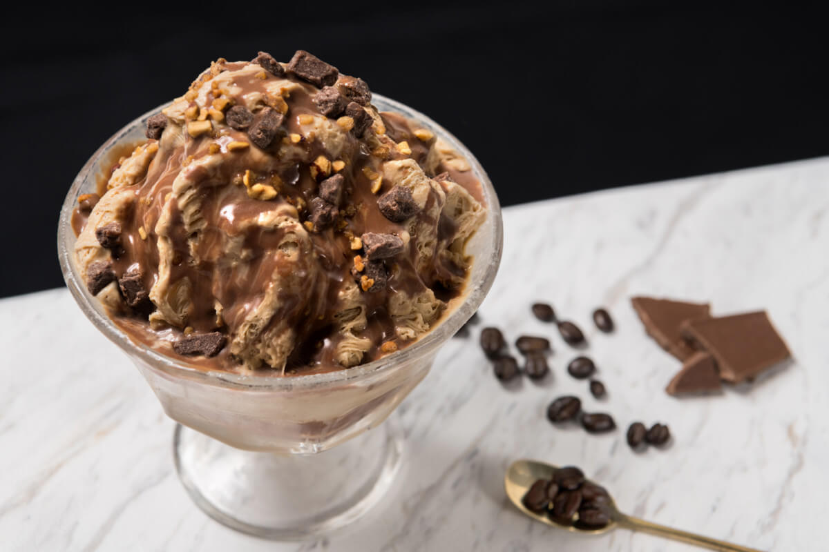 「ミルクチョコレートコーヒーかき氷」は、コーヒーの芳醇な香りを濃縮したコーヒーアイスブロックを削り、ミルクチョコレートをかけて、仕上げにミルクチョコチャンクやヘーゼルナッツビッツを散りばめた上品な甘さがくせになる大人のかき氷。