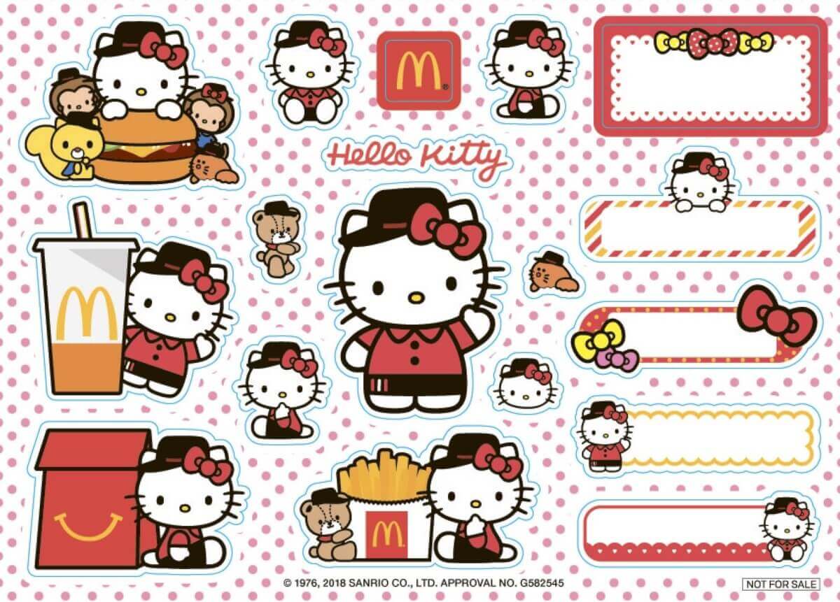 クルーユニフォーム姿のハローキティとその仲間たちが、ハンバーガーやマックフライポテト、ドリンクカップと一緒になったオリジナルコラボシール。