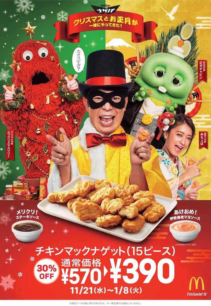 販売期間:「メリクリ!ステーキソース」「あけおめ!伊勢海老マヨソース」2018年11月21日(水)~2019年1月上旬(予定)/「チキンマックナゲット15 ピース」特別価格 2018年11月21日(水)~2019 年1月8日(火)(予定)