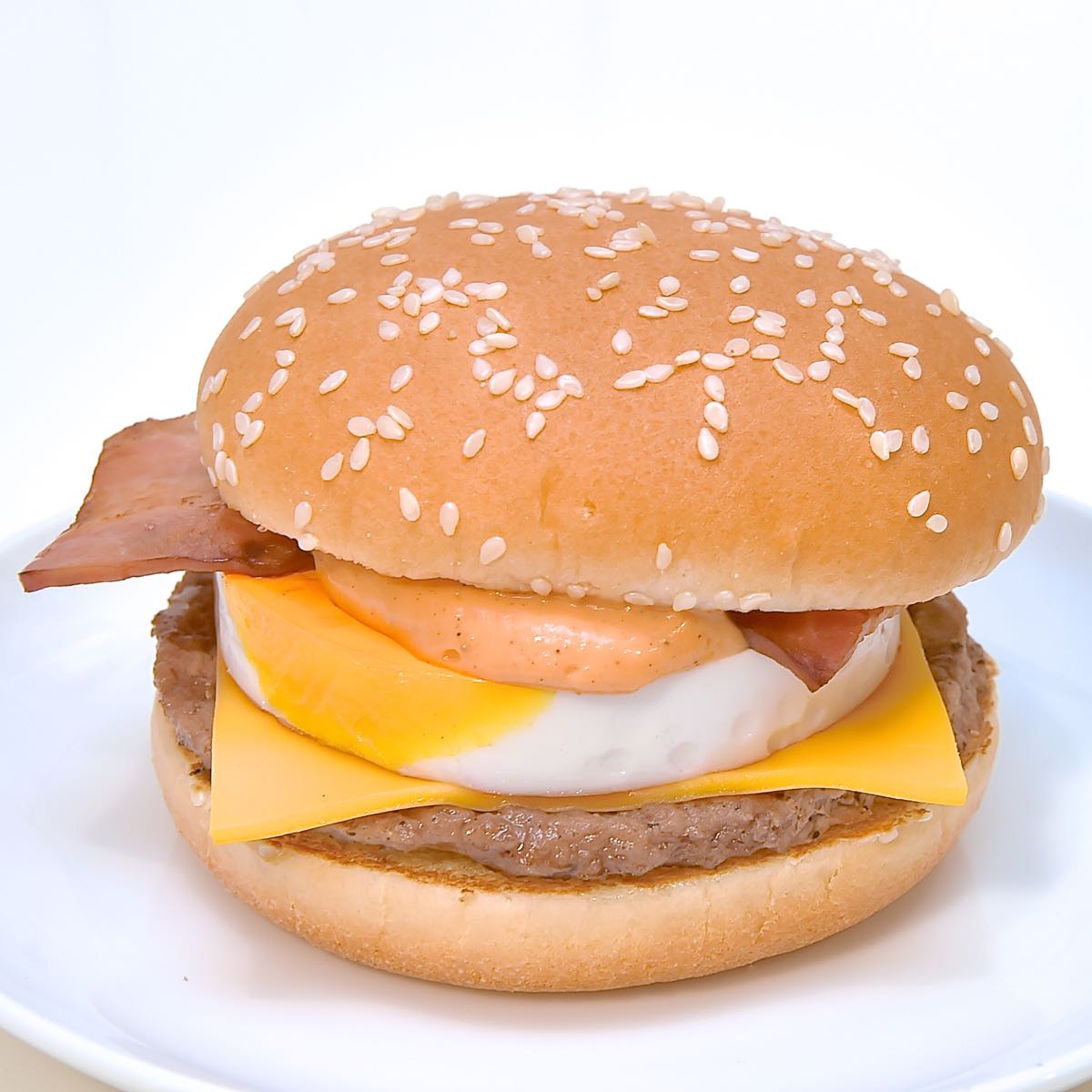 「月見バーガー」のために作られたトマト風味のクリーミーで濃厚なオリジナルのオーロラソースで味付けし、月に見立てたぷるぷるたまごとジューシーな 100%ビーフパティに、グリルしたスモークベーコン、コクのあるチェダーチーズを加えて、香ばしいゴマつきバンズでサンド。