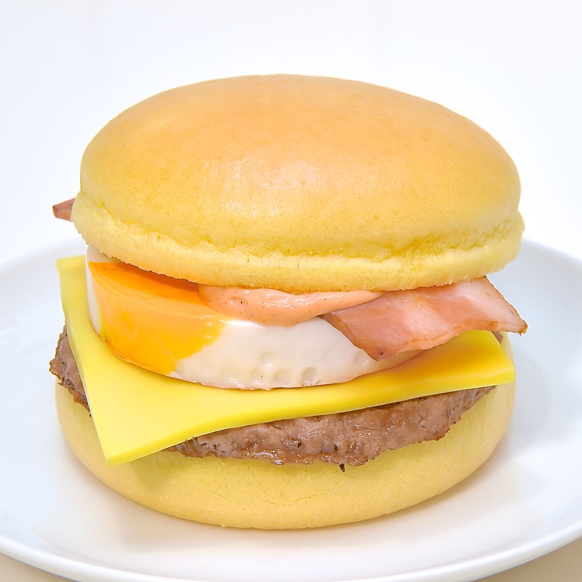 100%ビーフパティの上に、とろ~り濃厚なコクのある厚切りチェダーチーズ、ぷるぷるたまご、グリルしたスモーキーなベーコンを重ね、発酵バターの風味豊かなふわふわスチームバンズでサンド。