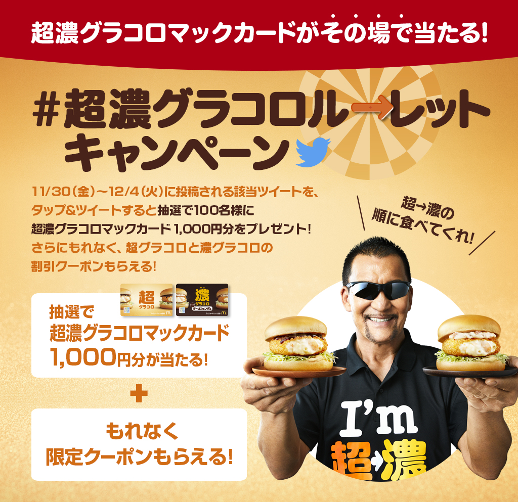 <STEP2> @McDonaldsJapanが投稿した、またはこのキャンペーンに応募した人が投稿した「#超濃グラコロルーレット」のハッシュタグが付いたツイートから「#超濃グラコロルーレットをツイートして止める」を選択し、「#超濃グラコロルーレット」と「#超グラコロ」と「#濃グラコロ」を含めてツイート