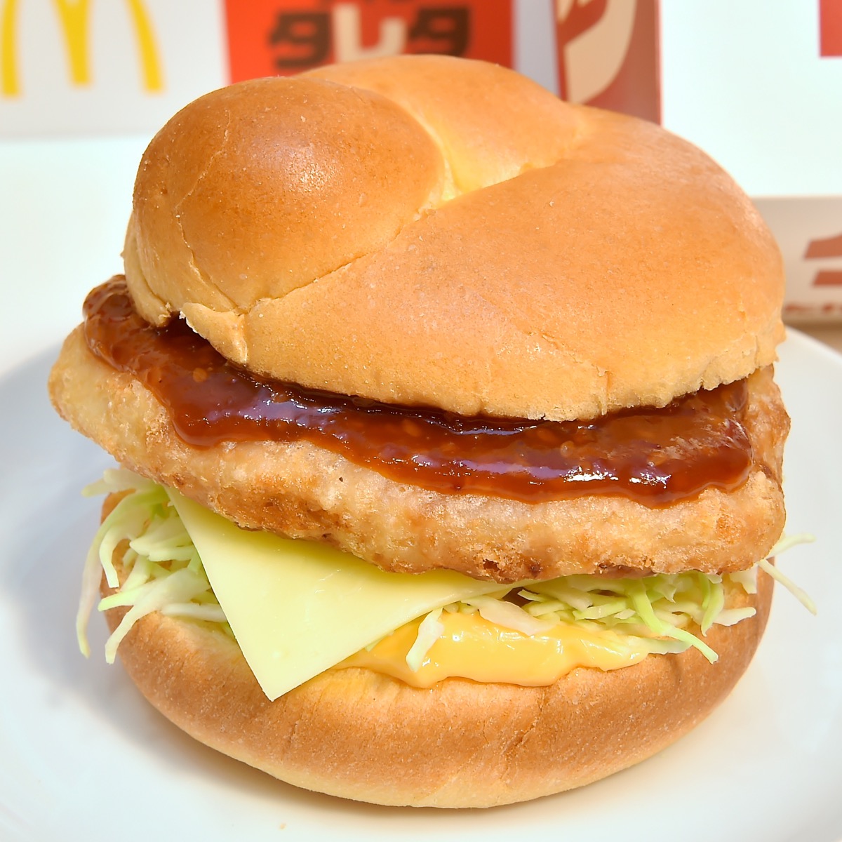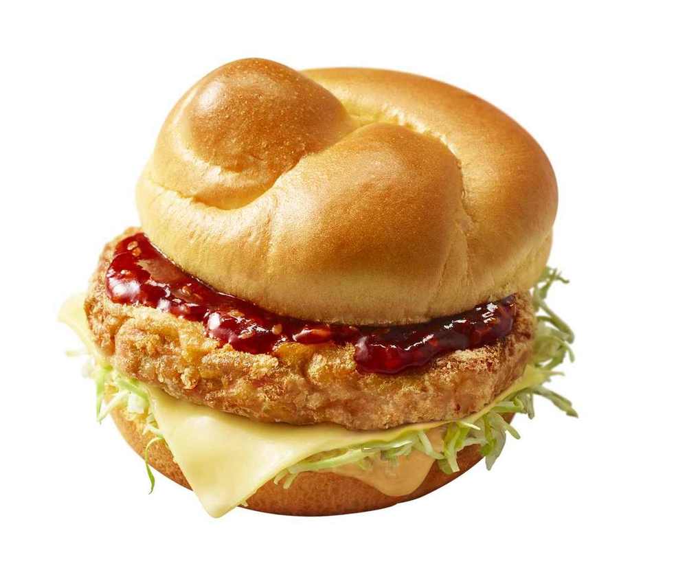 ほのかな甘みのあるふんわりとした食感の オリジナルバンズに、生姜醤油の風味香るやわらかなチキンパティを、シャキシャキの千切りキャベツ、クリーミーでちょっぴり辛味のあるソースとともにサンドした、日本ならではの人気商品となっています。