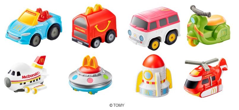 ハッピーセットでもらえる「チョロQ」は、車をテーマとしたチョロQ(第1弾)と空の乗り物をテーマとしたチョロQ(第2弾)、全8種のおもちゃがラインナップ。