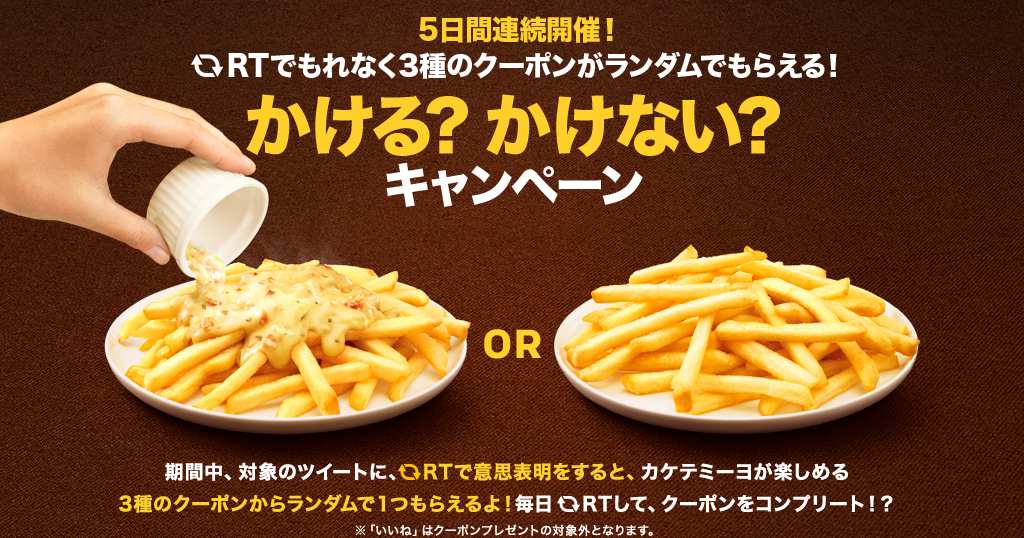 内容:マクドナルド公式Twitterアカウント(@McDonaldsJapan)をフォローし、同アカウントに投稿されたキャンペーン対象のツイート「#かけるかけないカケテミーヨ」のついた投稿を公式リツイートすると、もれなく全員に、キャンペーン返信用アカウント(@Love_McD)より、お得なクーポンが@返信で届きます。