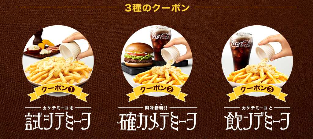 キャンペーン期間中、マクドナルド公式アカウントから投稿される対象のツイートに、リツイートで意思表明をすると、「カケテミーヨ カルボナーラ」単品、もしくはセットやドリンクとともに楽しめる3種類のお得なクーポンの中からランダムで1つをもらうことができます。