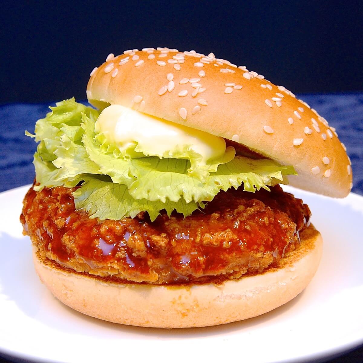 サクサク衣のムネ肉のチキンパティに、甘辛いてりやきソースがたっぷり絡みます。
