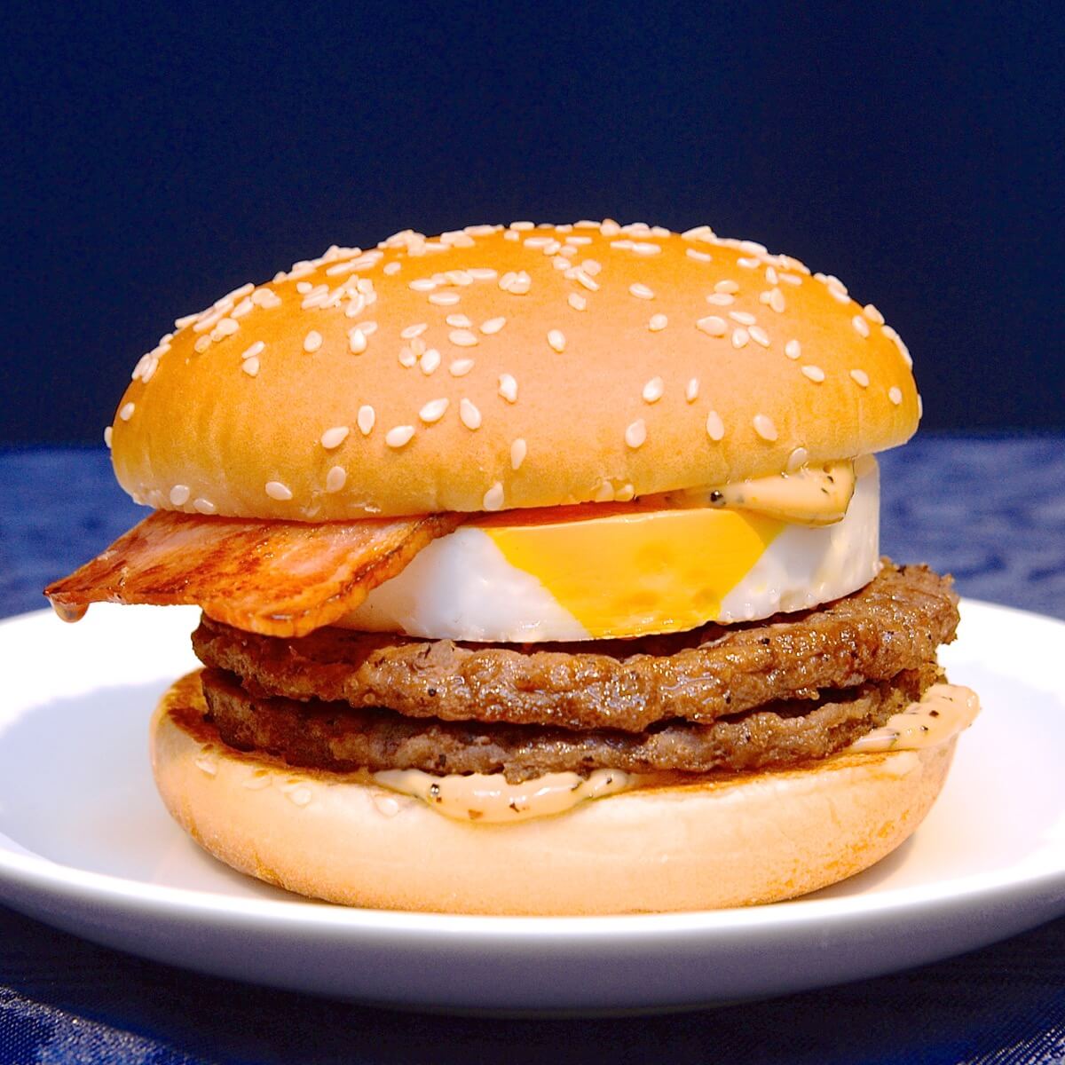 2枚のビーフパティとぷるぷるのたまごに、スモーキーなベーコンをプラス。