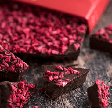 ダンメンベルグ/ダークチョコレートバーの上にラズベリーを贅沢にトッピングした砂糖不使用チョコレートです。