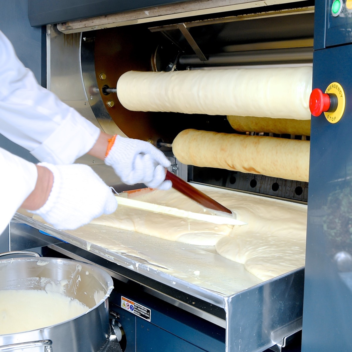 工場隣接型の店内で焼き上げたバウムクーヘンの販売や、