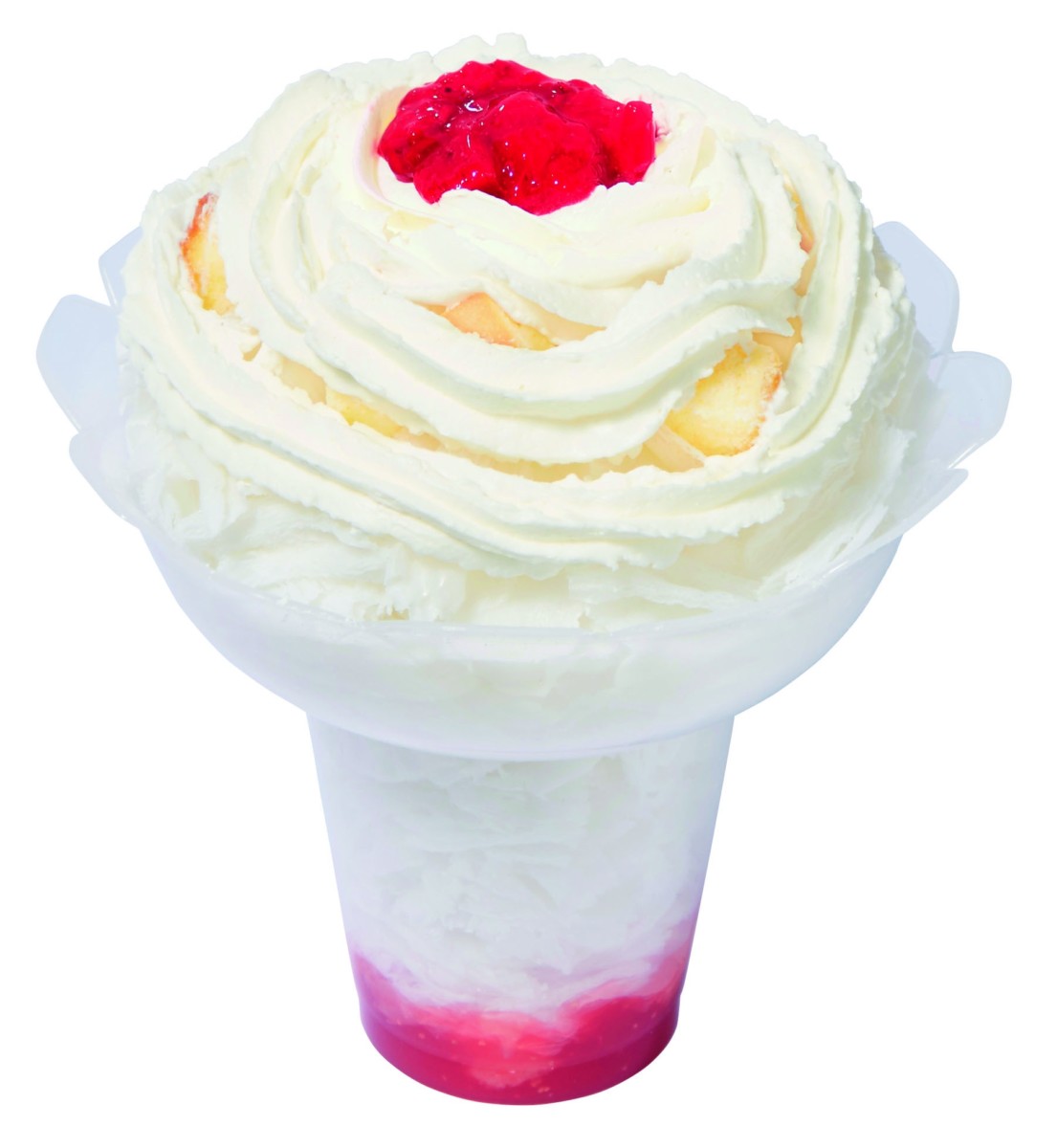 2つめはミルク風味の氷をベースに、ホイップクリームや果肉入りストロベリーソースなどを合わせた「コットンスノーキャンディ ショートケーキ」。
