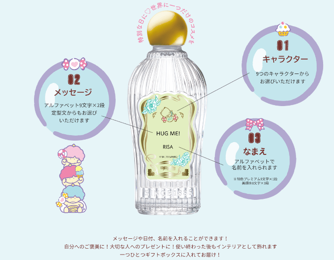 好きなキャラクターのアイコン1つと、メッセージ、名前を入れることで、世界に一つだけのオーダーメイドコスメが出来上がります☆