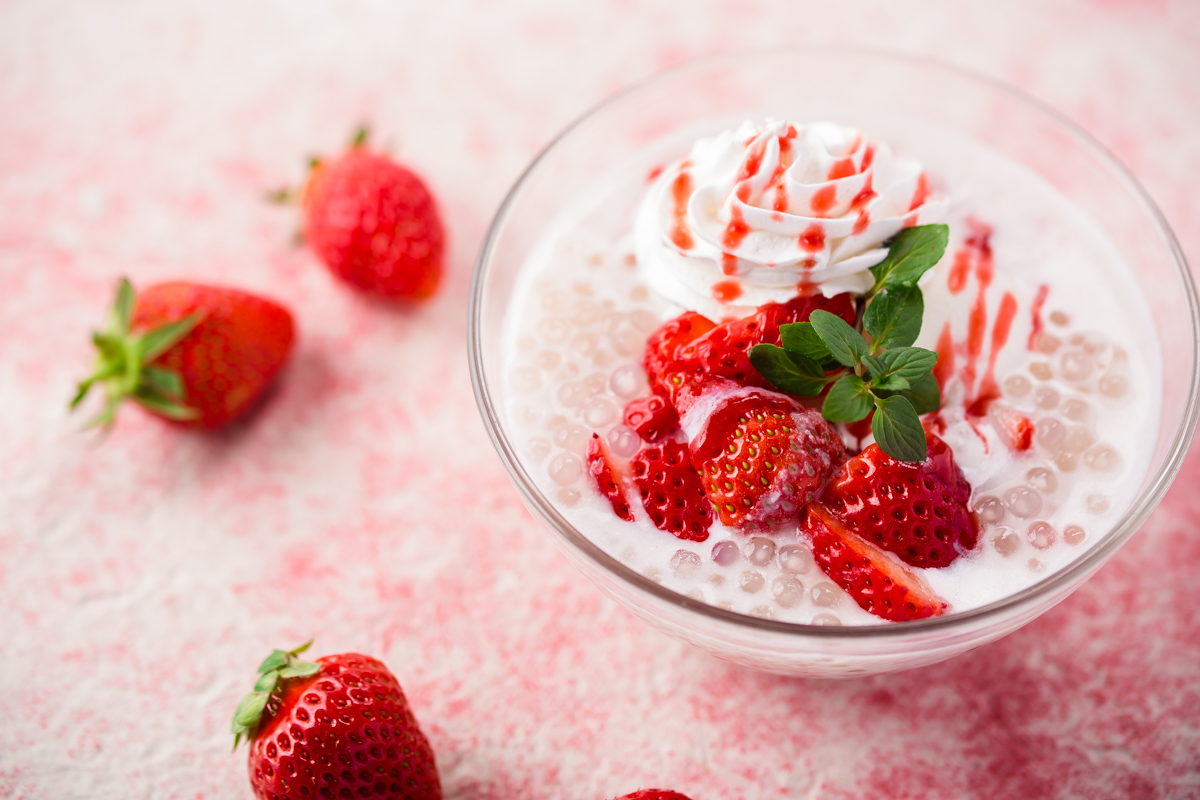 ココナッツミルクにアイスクリームやタピオカ、いちごプリン、甘酸っぱい生いちごを浮かべた「ストロベリータンゴ」