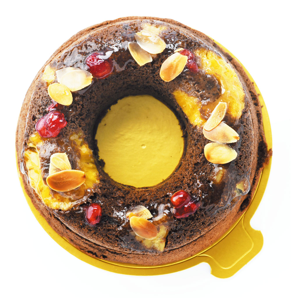生チョコレートがサンドされた濃厚なチョコレートケーキに、パイナップルやクランベリー、アーモンドスライスをトッピング。