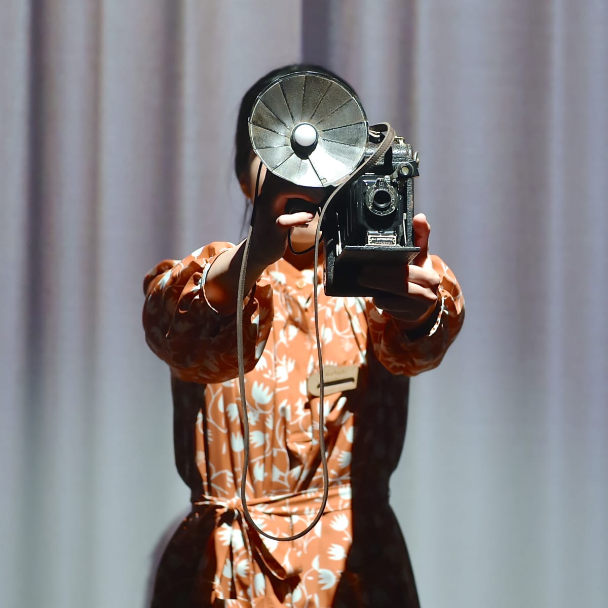 アトラクションスタートの前に、案内役のガイドが、ムーミンパパのカメラで記念撮影!