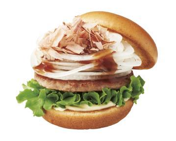 グリーンリーフとジューシーなパティ(肉)の上に、オリジナルのたまねぎバーガー用ソース、輪切りにスライスした淡路島産新たまねぎをたっぷりとのせ、その上からまた、たまねぎバーガー用ソースをかけ最後に、かれ節※を原料として使用したかつお節をトッピング。