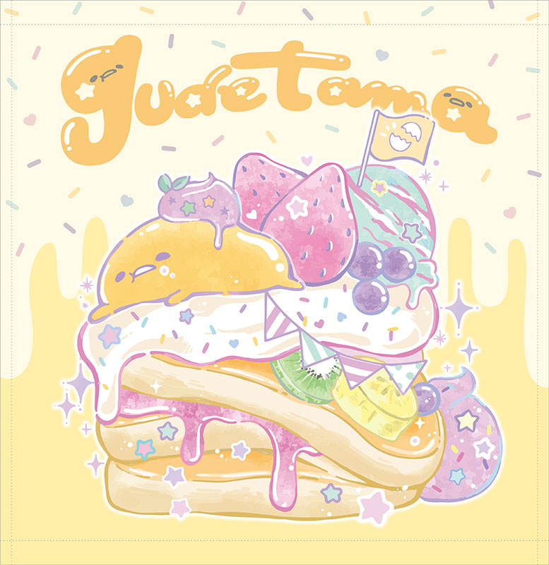 フルーツがたっぷりのったパンケーキの上でぐでっと寝そべる「ぐでたま」デザインのハンドタオル。